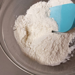 First, combine all dry ingredients. Toss in butter and work into the dry ingredients with your fingers until mixture is sandy with small pieces of butter left.